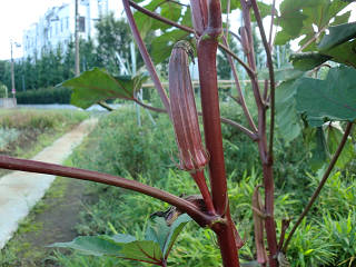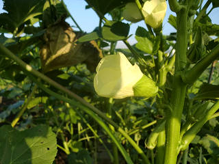寮から事務所の途中にある畑、実に多くの種類の野菜が栽培されています。 今はオクラが真っ盛り!!