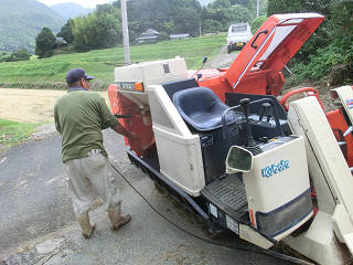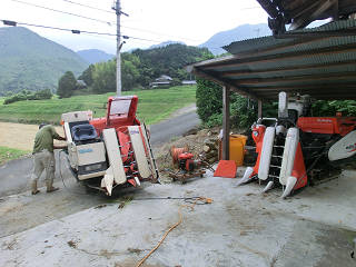 朝、親戚がたまりかねて稲刈りの応援に駆け付けてくれました。 ひげも連日の作業で疲れきっていますが、弱音を吐くわけにはゆきません。