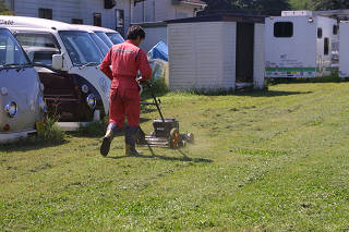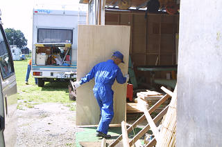 「暑い、暑い!」 と言いながら草刈に勤しむやまさん。 「使い勝ってが悪いから、全面改良だよ。」 とコンパネを仕入れてきたすーさん。