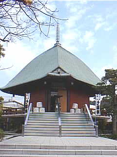 ねたね)の子孫である胤貞の屋敷跡に、日英を開山として建立された日蓮宗の寺です。 千葉胤貞が千葉の本領へ移るに及んでこの寺が建立されました。 現在本堂には、日蓮上人像、日親上人像、日英上人像、釈迦如来像、千葉胤貞像などが祀ら れています。 開山2世の日親は凄絶な布教ぶりで知られる僧で、「立正治国論」を説いて6代将軍・足利義 教をいさめようと京に上りましたが聞き入られず、逆に義教の逆鱗に触れて投獄させられてしま いました。その時に数々の拷問を受けますが、頑として自説を曲げなかったといいます。 その時に舌を切られ、頭に焼けた鍋をかぶせられる極刑を 科せられましたが、自説を曲げなか ったといいいます。 この逸話から「鍋かむり日親様」の名で呼ばれるようになりました。境内・池の奥の日親堂には 日親上人の石像が安置されています。 寺の墓地には演劇界で名を残した丸山定夫の墓碑があります。 |
