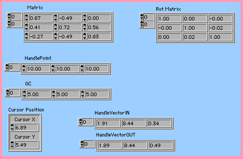 画面上のカーソルのドラッグされた座標をもとに、表示データの座標系のz軸周りの回転量とディスプレイのX軸周りの回転量に分解して回転マトリックスを作るのがこのVIの役割だ。