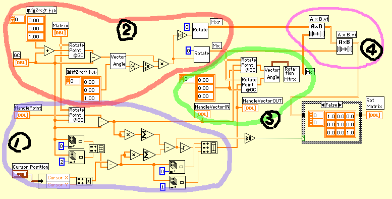以上、簡単な説明だったが、カーソルの動きに応じた回転マトリックスの変化分を出力し、(35話で説明した)呼び出し側のダイアグラムの中でWhile Loopのシフトレジスタにある現在の回転マトリックスに掛けることで最新の回転マトリックスを計算している。