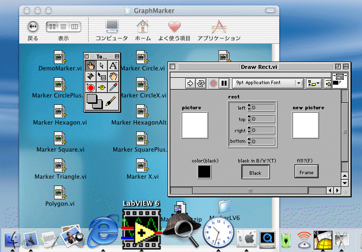 LabVIEWのG言語はバージョン3で基本が固まったように思う。それ以降はUNDOの実装に見られるように開発環境の整備と、画像処理技術、ネットワーク技術など対象領域の拡大を図ってきた。残念ながらバージョン5ではプラットフォームに依存しない開発環境に陰りをみせた。Mac版ではバージョン5の魅力が少なかったのであえてアップグレードをパスしたのだが、今年は予算を組んでバージョン6のWindowsのプロ版とMacの開発版を入手できた。詳しくは比較していないのだが、バージョン6ではWindows版とMac版の機能の差は少ないように感じる。