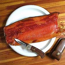 3)風乾したサケはスモークウッを使って3時間ほど燻煙をします。(ここで味見、これもなかなかいけます。) 4)つぎにスモークチップを使て、1時間ほど温燻をします。温度60度前後を保つようにします。燻煙が終わったらそのままにして、完全に温度を冷まします。完全に冷めたら、ラップに包んで冷蔵庫いれます。(身が切りやすくなります。) これでできあがり。