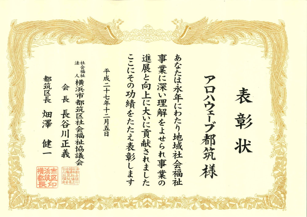平成27年12月5日、横浜市都筑区社会福祉協議会より感謝状を頂きました。