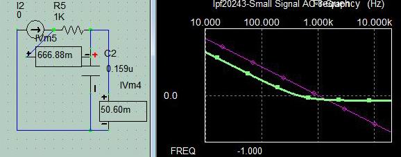 Cap.に流れる電流は電流リミット値( Vin / 直列抵抗値)のHPF特性。 結果電圧特性は通過帯域MAX値 (Vin/2)のLPF特性になります。