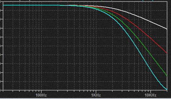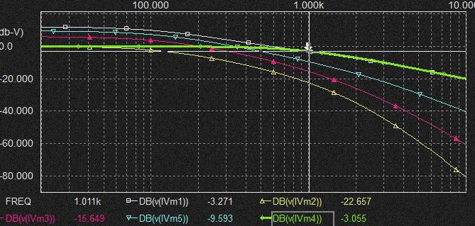 また基本CR passive FilterのBuffer無し多段接続なので後段にいくほど通過帯域のGaniは低下しています。これは後ろのCR filterほど分圧される率が減るためとBuffer無しなので後段の負荷の影響を受けてFc付近の肩特性がなまるためです。