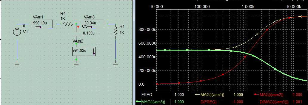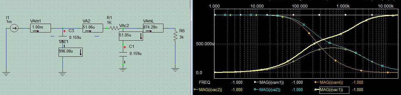抵抗負荷が無ければ電流はHPF特性だけですが負荷抵抗が付いただけでめまぐるしく複雑になります。ポイントは1次LPFなのでCap.を流れる電流は必ずHPF特性でそれを積分したものがCap.の両端電圧なのでLPF特性になり当然Cap.と並列の負荷RもLPFとなる。電圧の大きさはVinが抵抗分圧されているのでMAX 1/2となる。