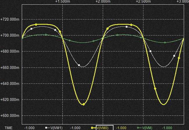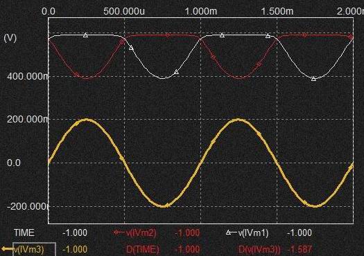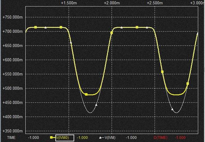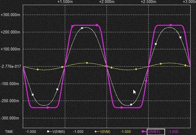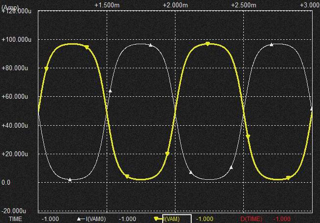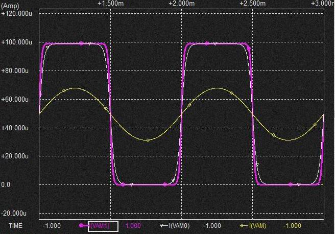 上図からも正弦波入力時電流特性はかなり矩形波に近くなっても(下図)負荷にかかる電圧はTr./Diodeにおいては電流(Ic)-->( LOG変換)---> 電圧(Vbe,Vak)で、差動で取り出したoutputはSIN波に近い形を保ちます。 この部分はMagicめいていますが上の方の説明のようにAUDIO信号の2っのB-E間にかかる電圧がマイナス方向にかかる時はほぼAUDIO信号と同じでQ1、Q2のVbeの変化は逆相なのでその部分だけMIXされれば印加AUDIO信号に近い形になるわけで、実際はLOG圧縮された半周期の波形もMIXされるわけですがその面積は小さいのであまり歪まない。(*1) 一方VCAの場合は抵抗負荷なので電流波形がそのまま電圧波形のなるので歪みます。