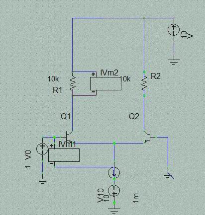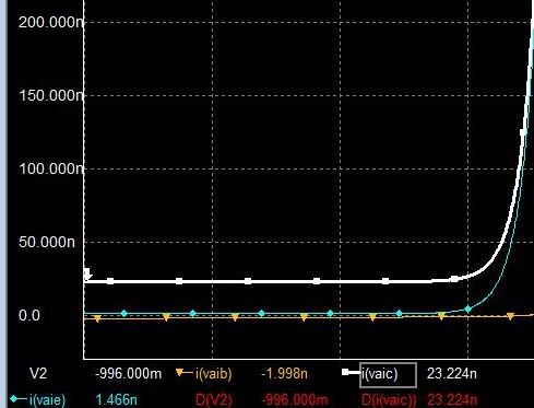 ちなみに負荷がdiodeでも同様です。Transistorがdiode接続なのでそうなるのかと思い通常のTransistor動作に設定しても同様でした。普通はこんな大きな電圧を入力にはかけないでしょうが。
