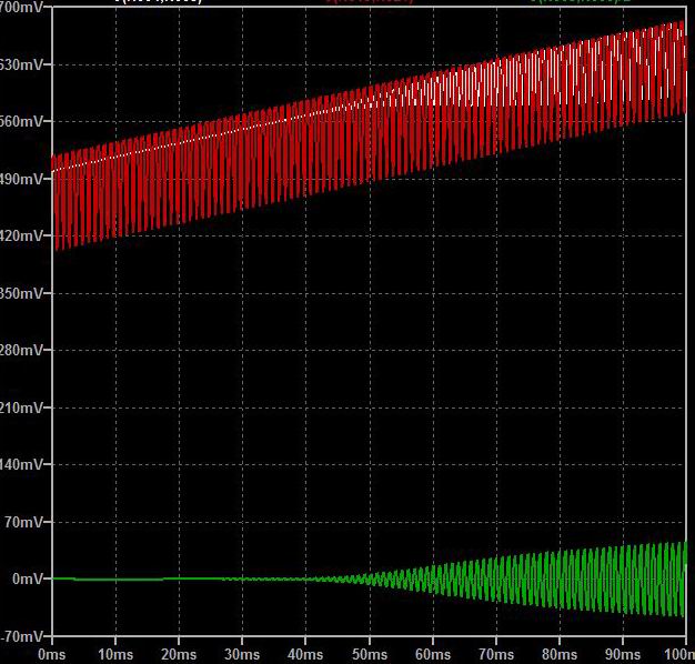 300mVを印加した時の差動対Tr.のVbeと負荷Tr.のVbe波形