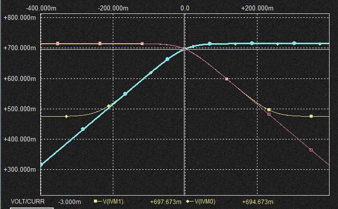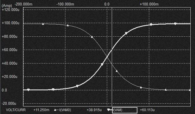 上図はテイル電流が1mAの時と10mAの時のQ1、Q2のVbeの関係のグラフですが当然BIASが変化して動作点は変化していますがカーブの変化は同じ形になっています。 これはすなわちtransistor、Diodeを差動の負荷にした場合、AUDIO信号の変化は同じレベルになることを示しているわけです。(これによりVCA化をさける)