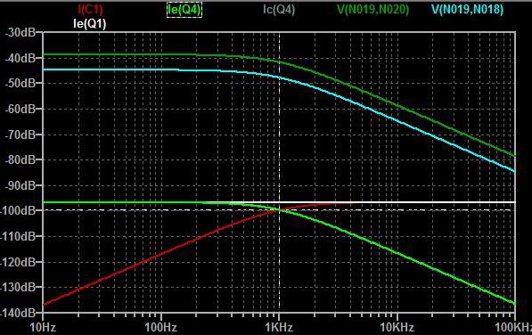 Capacitorのインピーダンスが微分抵抗の値に較べて十分大きければCap.には電流が分流せず差動対のコレクタ電流がそのまま1から4段目の各Tr.のC-E間をロスなく流れてゆき4段目の負荷Tr.で電圧化されますのでこの時最大振幅となります(Ibを無視した場合)。 通過帯域の特性。 逆にCap.のインピーダンスが微分抵抗の値より十分小さければCap.側に電流が流れTr.側には流れませんのでAUDIO信号電流は減衰し負荷Tr.での電圧出力は低下、Fc以降の遮断領域ではcapacitorの特性を反映し1/f特性になります。