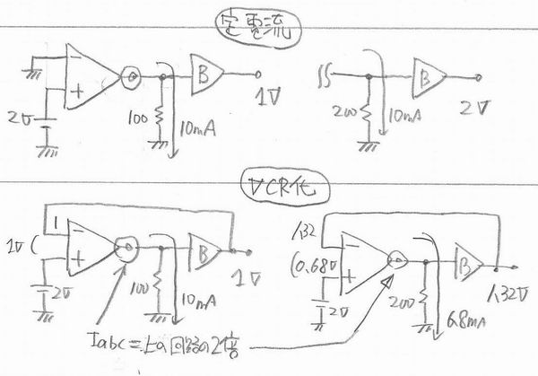 通常の抵抗の直列接続ではRを100Ωから200Ωにすれば抵抗値が上がるので電流は減って印加電圧を2V固定とした場合 10mAから6.8mAに低下します。上記の負帰還がかっていないOTAの場合は電流値が変わらないのでOTAは抵抗動作にはならないということになります。