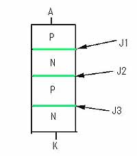 PN junctionが 3っある素子でA-K間に高抵抗を介して+/-の電圧をかけると