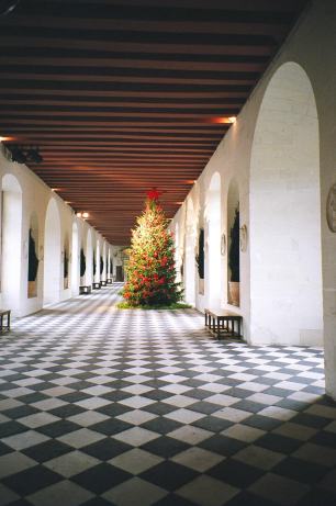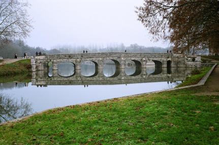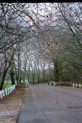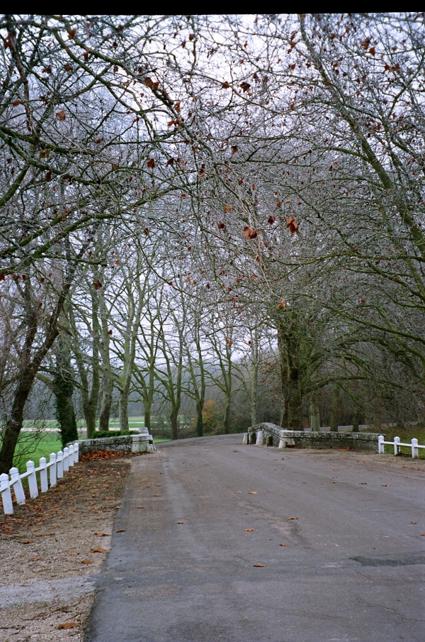| お城の前の橋です。川に写ってきれいでしょ。 | 木が白く見えませんか?霧氷なんです。 この日の移動中は1日中、いろんな所で見かけました。 もっときれいな所がもあったのですが、撮ってないんです。 ここでやっと、クリスマスツリーが白く着色されていた訳がわかりました。 フランスではよく見かける光景なんですね。 |