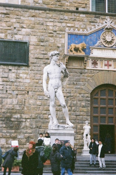 ![]() ヴェッキオ宮殿の前にあるミケランジェロのダヴィデ像です。これはコピーで本物はアカデミア美術館にあります。アカデミア美術館の入り口は目立たなくわかり難かったです。出口は外からすぐわかるんですけど・・・ |