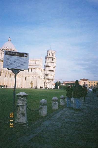| ご存知ピサの斜塔です。えっ?傾いてないって? これは傾いた側から見上げて撮ったものなので。 |