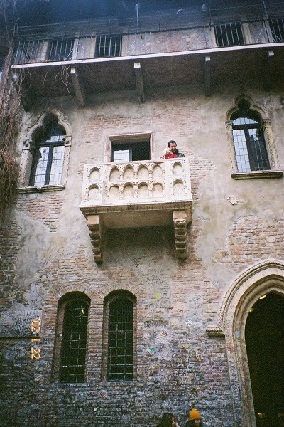 ![]() ジュリエッタの家(バルコニー)です。バルコニーお二人は一般の方です。下から見ている観光客の要望に応え、ロミオとジュリエットを演じてくれてます。 |