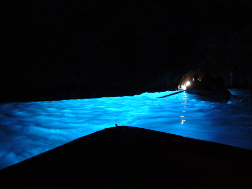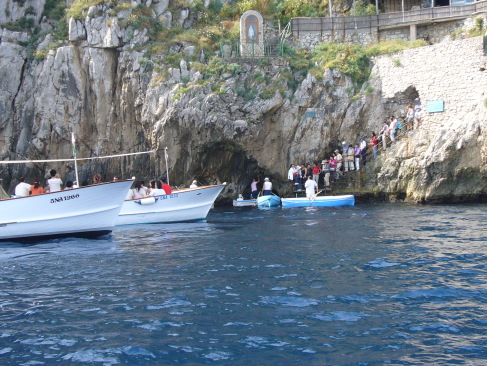 青の洞窟の入り口。4人乗りのボートで中に入ります。 中に入るときは寝そべらないと頭を打ちます。 |