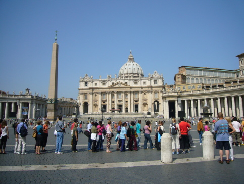 バチカン市国、サンピエトロ寺院です。 手前の列はサンピエトロ寺院に入るための列。 午後は並んでいなかったそうですが・・・。 |