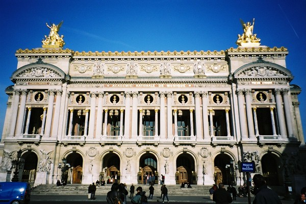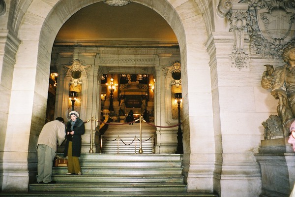 オペラ座の中(入り口)です。この日はリハーサル中のため劇場内部の見学はできませんでした。あぁー、シャガールの天井画・・・ |