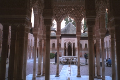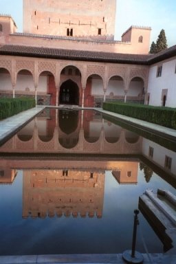 アラヤネスの中庭 池に写る建物が綺麗でしょう。 朝一番の入館でかつ、ガイドさんのすぐ後ろにくっついて行ったので、 人が写っていない写真が撮れました。 |