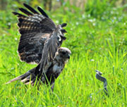[8/14 越夏ノスリ] 岡部 埼玉県川島町のノスリ越夏個体が、電柱から休耕地の草原に降りたので、 見ていると、地上で何かを攻撃している様子。 近寄って見ると、大きなアオダイショウを襲っていました。 ヘビが激しく抵抗するので攻めあぐねて攻防は20分あまり続き、 最後は諦めて飛び去りました。 |