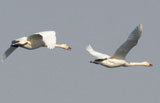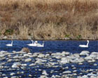 [1/18 多摩川にコハクチョウ] 藤原(郁 15時頃自宅(府中)近くの多摩川で5羽の白鳥が飛ぶのを見つけ、 翌19日10時頃、降りたあたりの川の中州でコハクチョウ5羽が休息 しているのを発見。残念ながら人が近づき、東南東方向に飛び去りました。 |