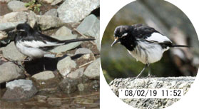 2008年には胸に縞模様もある個体を同じ場所で観察していますが(写真右)、同一個体または遺伝子を受け継いだ別個体でしょう。 セグロセキレイはハクセキレイに近い白化個体は時々観察されるようですが、 黒化は珍しいようで、両種の交雑も未だに確認されていません。 | |