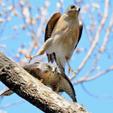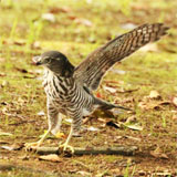 [ツミの繁殖行動始まる] ツミが繁殖場所に戻り、♂の♀への餌運び、疑似交尾などの行動が見られ るようになりました。 3/23 中野区の公園で、♀が枝にとまり、♂が鳴きながら飛びまわる。高野T 3/24 小平の自宅近くの上空に2羽 奥村 4/4 小平の公園でメスがとまっていました。奥村 |