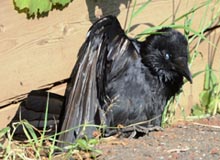 [5/10、カラスの蟻浴] 岡部 自宅近くの林でツミの観察をしていた際、林縁の道路脇でハシボソガラスの蟻浴行動を観察。私は大分前にカケスが行うのを見て以来でした。 アリの巣を破壊して、全身に群がるアリを捕えては潰し、羽毛に擦り付けていました。 目は瞬膜を半分閉じて恍惚の表情。 |