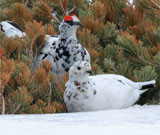 一面の雪景色の中、ライチョウ以外ではカヤクグリが盛んに囀り、イワヒバリ