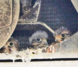 [チョウゲンボウの繁殖] 岡部 勤務先の職場の社屋(狭山市)三階部分の公道に面した排気ダクトでチョウゲンボウが繁殖4月初めにペアの繁殖行動が見られ、6/1に3羽の雛を確認。毎週末に職場に出かけ観察を続けました。 |
