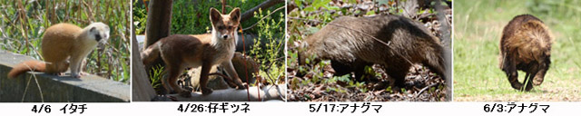 [6/3 アナグマ] 奥村 高尾の森林科学園の山道でイタチのような動物と鉢合わせして、逃げる 後姿を撮りました。アナグマでした。 [5/17 アナグマ] 岡部 上信県境の内山牧場から神津牧場へ行く路上からニホンアナグマを見、 滅多に会えない動物を、真昼間に見て感激。 [4/26 ホンドギツネ] 岡部 川越の自宅近くで昨年キツネを観察した近くで仔ギツネを見ました。 [4/6 ニホンイタチ] 岡部 上記の場所で頭頂部は白に近い色の非常に淡色のニホンイタチがいました。 |