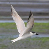 [9/28 三番瀬でハシブトアジサシ] 大場 潮が引き干潟が出始めた10時過ぎに飛び始め、小さなカニを低空飛行で 巧みに捉えていました。時々水辺に降りて海水を飲んでいるような仕草をして いました。またミヤコドリが100羽程いました。 |