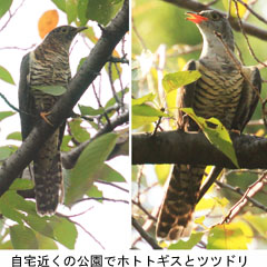 [ツツドリとホトトギス] 練馬区・加藤(博 私がフィールドにしているM公園(今年ツミの巣立ちを2回確認)で、 ツドリ(9/30)とホトトギス(10/4)とを観察しました。いずれも桜の木 の毛虫を食べていました。 |