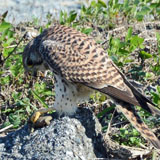 しばらく弄んでいる様子でしたが、やがて獲物を咥えて石を降り、歩いて獲物をアカザの根本に隠して飛び去りました。残された獲物はトウキョウダルマガエルでした。 チョウゲンボウが建物の隙間などに獲物を隠す行動は知られていますが、実際に見たのは初めてです。 | |
