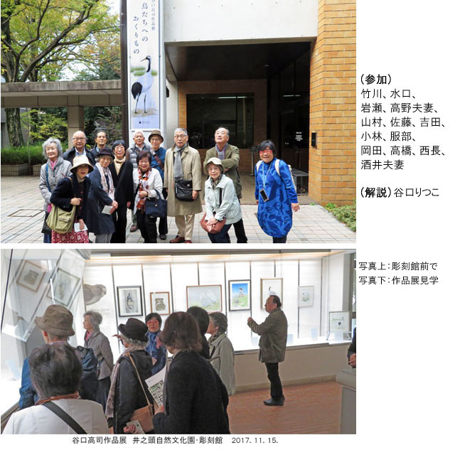 2017年11月15日(水) 井之頭文化園の彫刻館で開かれている谷口高司氏の作品展の 見学と昼食会を、10月の丹沢札掛への参加者を中心に呼びかけて 行った。 参加は15名で、谷口氏も参加の予定であったが、発熱などで 参加できなくなったので、谷口りつこ夫人の案内で作品展を見学。 その後、吉祥寺のビストロ・トークバックに移動して昼食を とりながら談笑した。 | |