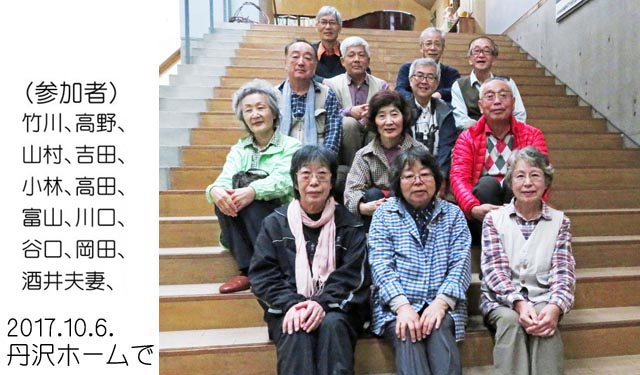 2017年10月5日(木)〜6日(金) 「50年ぶりの丹沢札掛合宿」と称して、1965年当時に同好会の3年から1年だったOBに呼びかけ、札掛の丹沢ホームで1泊。 養魚場や栄光ヒュッテの見学や、折からの十六夜の月を見上げて夜の林道歩き。鹿の声を求めて一ノ沢峠付近まで往復など。残念ながら鹿の声は雌の警戒温のみで、雄鹿の長く引く鳴き声は聞けなかった。 | |