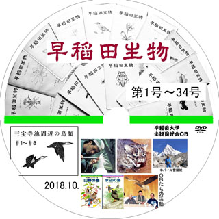 早稲田生物DVDの作成 生物同好会の機関誌「早稲田生物」の1号(1953)から34号(1992)、 鳥獣班発行の「三宝寺池周辺の鳥」の1号(1966)から8号(2009)、 OBたちの活動(石川隆史、近辻宏帰、高田勝、谷口高司ほか) などを収めたDVD−Rが完成し、OBたちに配布をはじめました。 |