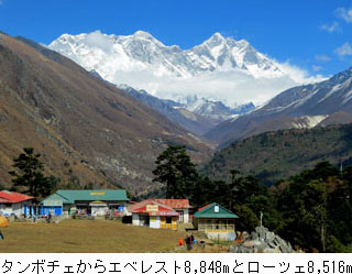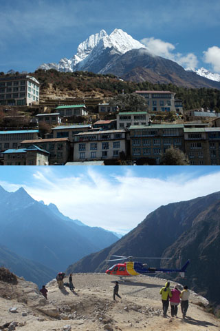 部屋に行ってみると、起きないというより意識がないという状態なのです。「 まずい!高山病だ」と直感しました。 すぐにガイドを呼んで、医者を呼ぶよう頼みました。 やがて、医者が酸素ボンベを携えて駆けつけました。 かなり重度の高山病だということです。寝ている間に進行したのでしょうか。 救急のヘリコプターを呼んでカトマンズに下りるよう指示がありました。 ただし、40万円ほどの現金か、キャッシングが可能なカードがなければヘリは 飛んでくれないということです。皆様もトレッキングの際はクレジットカードを お忘れなく。 [左写真] ナムチェの町とタムセルク6608m 救急ヘリの到着 |