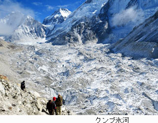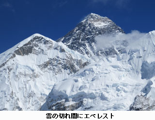 | 9日目、5:30起床。朝食後クンブ氷河を右に見ながらゴラクシェプ5,150mへ。11時にはゴラクシェプを出て最後の登りにかかります。周囲から雲が沸き起こりエベレストが見えたり隠れたりの状態です。急がなければと思うのですが、息が苦しく思うように進みません。足元は凍っています。悪戦苦闘の2時間を経て、やっと頂上にたどり着きました。 |