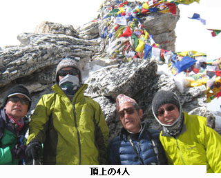 | 頂上は霧の中でした。風が強く寒さに震えます。エベレストが顔を出したのですがすぐ隠れてしまいます。前回のカラパタール(2,007年)では帰りもロブチェまで下って1泊したのですが、今回は慎重を期してゴラクシェプに泊まることにしました。私にとって最高所での宿泊記録となります。 |