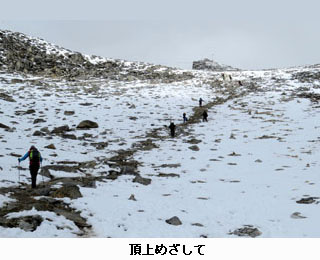| 8日目はロブチェ4,930mまでの登りです。枕元に置いていたペットボトルが凍り、振るとカシャカシャ音を出します。ロブチェ手前からは数日前に降った新雪が残っています。明日はいよいよカラパタール登頂です。お天気はどうなのでしょう。エベレストは見えるだろうか。無事登れるだろうか。高張る胸を押さえ眠りにつきました。 |