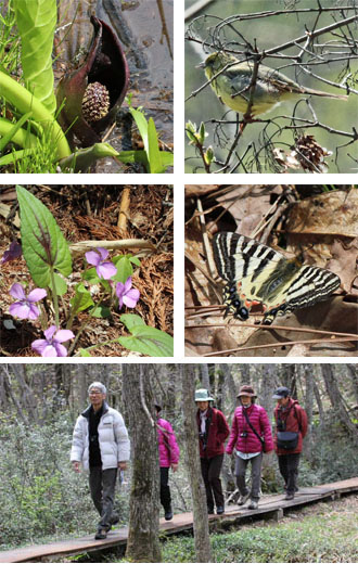 大町の湿原でミズバショウやザゼンソウ、チシオスミレなどの花を