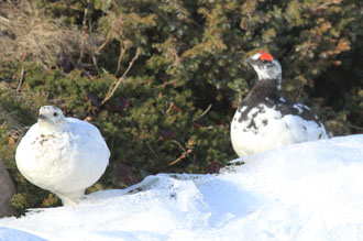 立山の冬羽の残る白いライチョウと雪山の大展望を楽しみ、