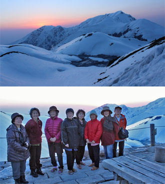新宿7:30→立川7:54→八王子→(特急あずさ3号)→松本→信濃大町11:01 大町駅で新潟から車で駆けつけた柳夫妻と合流。 TAXI2台と柳車に分乗してアルペンルートの出発点の扇沢へ。 扇沢12:00→(トロリーバス)→黒四ダム ダム展望台まで登り、快晴の黒部ダムや立山連峰などの雪山を眺めながら 持参した鱒すしで昼食。ダムを渡ってケーブル駅へう。 黒部湖駅→(ケーブルカー)→大観峰→(トロリーバス)→室堂 雪山の大展望を楽しみながら室堂へ。階段を登り室堂平の雪原に出ると、 立山連峰の雄姿が迫る。雪道を徒歩15分ほどで今夜の宿へ。 15:30 みくりが池温泉到着 |