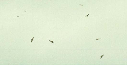 初めての長旅に出るこれらの幼鳥たちのうち、来春どの程度の数のタカが日 本に戻って来れるのでしょうか。これだけの数のハチクマが日本で繁殖して いるとは、普段夏山で出会うハチクマの少なさからみて信じられない思いも しますが、ひとつには帰って来られる数が少ないために、沢山育てた結果な のかもしれません。