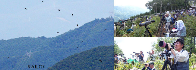 9月18日(土) 6時に山荘を出て、一気に白樺峠に向かいました。白樺峠方面に抜ける 乗鞍スーパー林道に入っても登って行く車をほとんど見ないので、連休初日 のためバーダーが集まるのはまだこれからかと思っていると、何と9:30に 到着した白樺峠下の駐車場や道路上は満車で、かなり離れた路上に車を止め ねばなりませんでした。 当然のことながら白樺峠の「タカ見の広場」は渋谷駅前交差点並みの人の 群れで埋まっていました。大部分の人は前夜に到着したのか、徹夜で車を 走らせて早朝に到着したようです。 | |